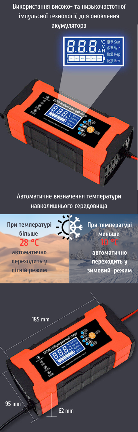 Зарядкою задоволений, користуюсь рік і жодного разу не підвела. Використовую її для заряджання батарей від мотоциклів, тому що займаюсь продажем б/у. До неї була радянська трансформаторна, то це небо та земля в порівнянні. Накинув клем, встромив у розетку і пішов у справах.